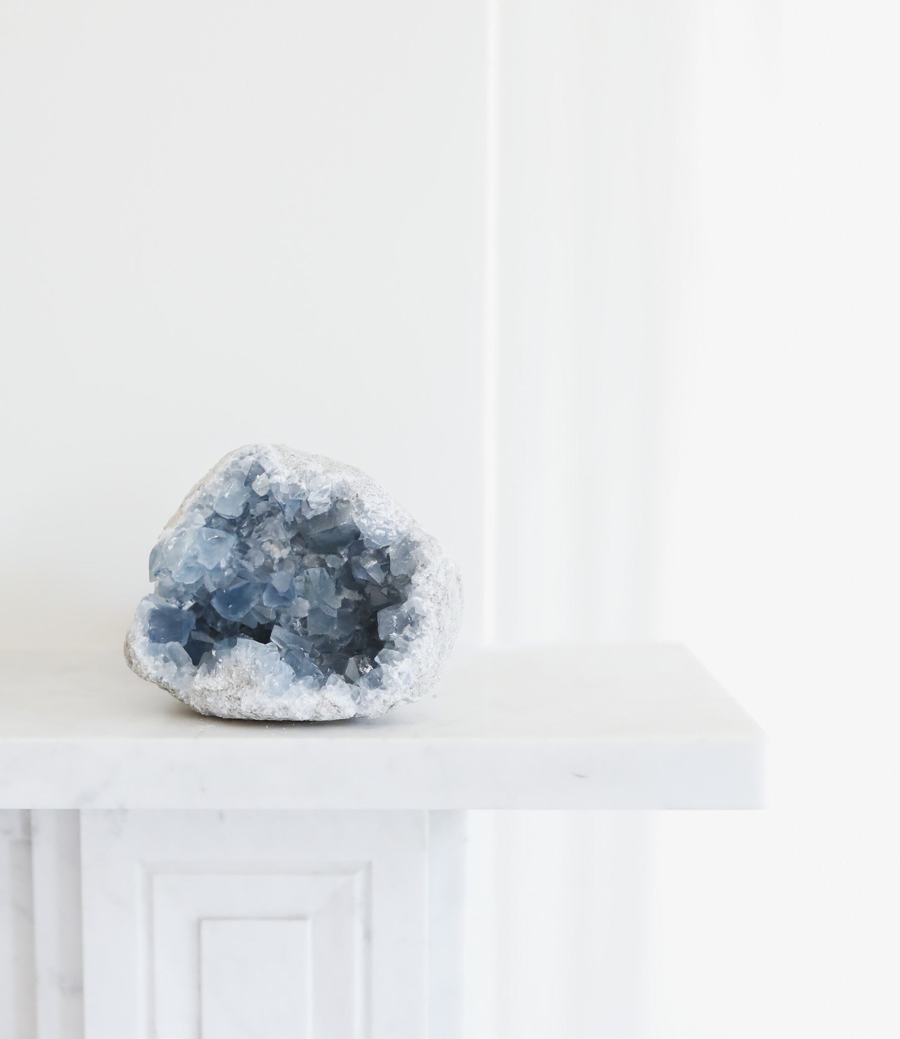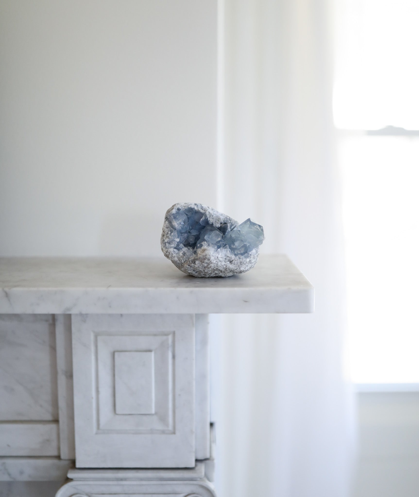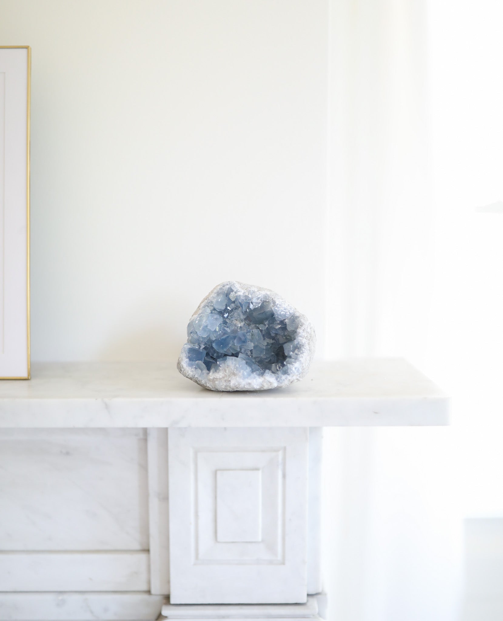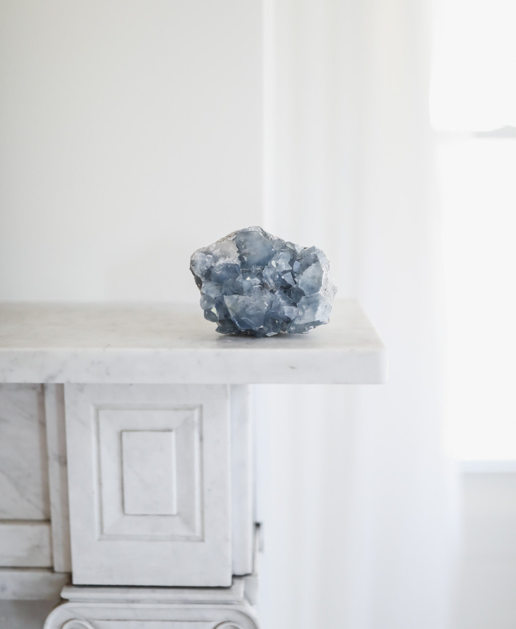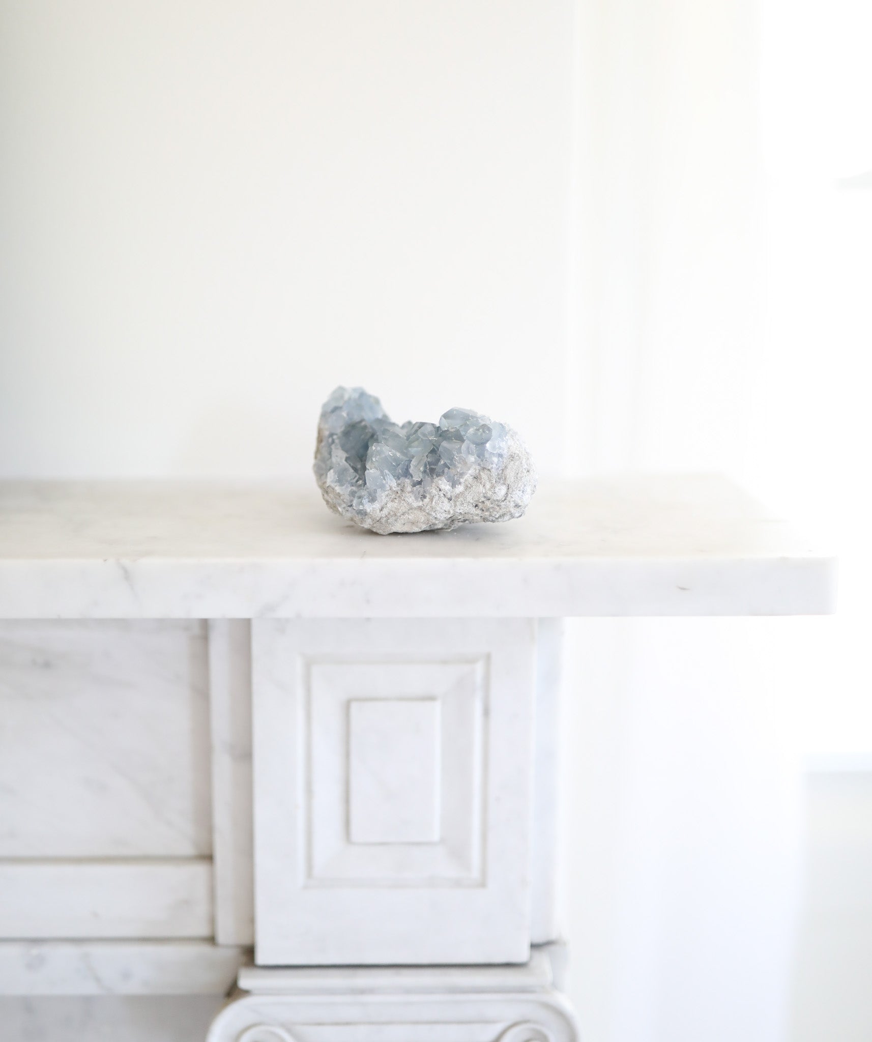 • This statement pieces of Celestite are one-of-a-kind and measures 3"-4.5" wide, 4"-6" long, and 2-4" high