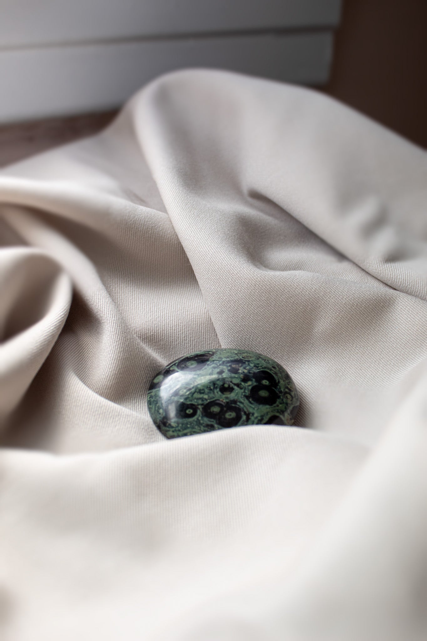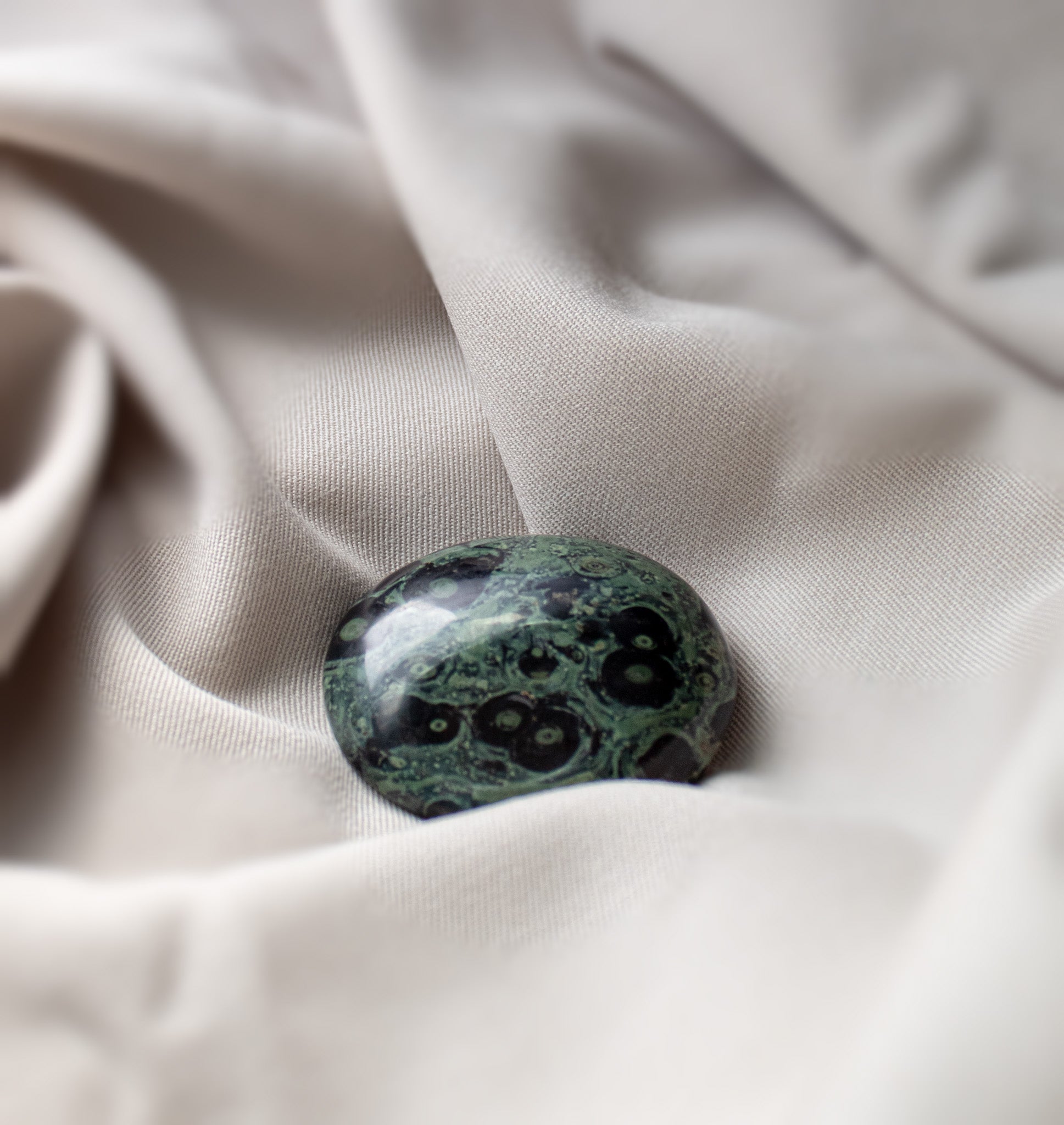 • Kambaba Jasper, also known as Crocodile Jasper, is a unique green stone found primarily in Madagascar, composed of microcrystalline quartz and various mineral inclusions (such as quartz, feldspar, cristobalite, and albite) and ancient fossilized colonies of cyanobacteria that create its distinctive pattern. The stone is actually not a Jasper, but a fossil. It is characterized by swirling, orbicular patterns of deep forest green and darker green to black markings that resemble algae or moss-like formations, giving it a texture and appearance reminiscent of a primordial landscape.