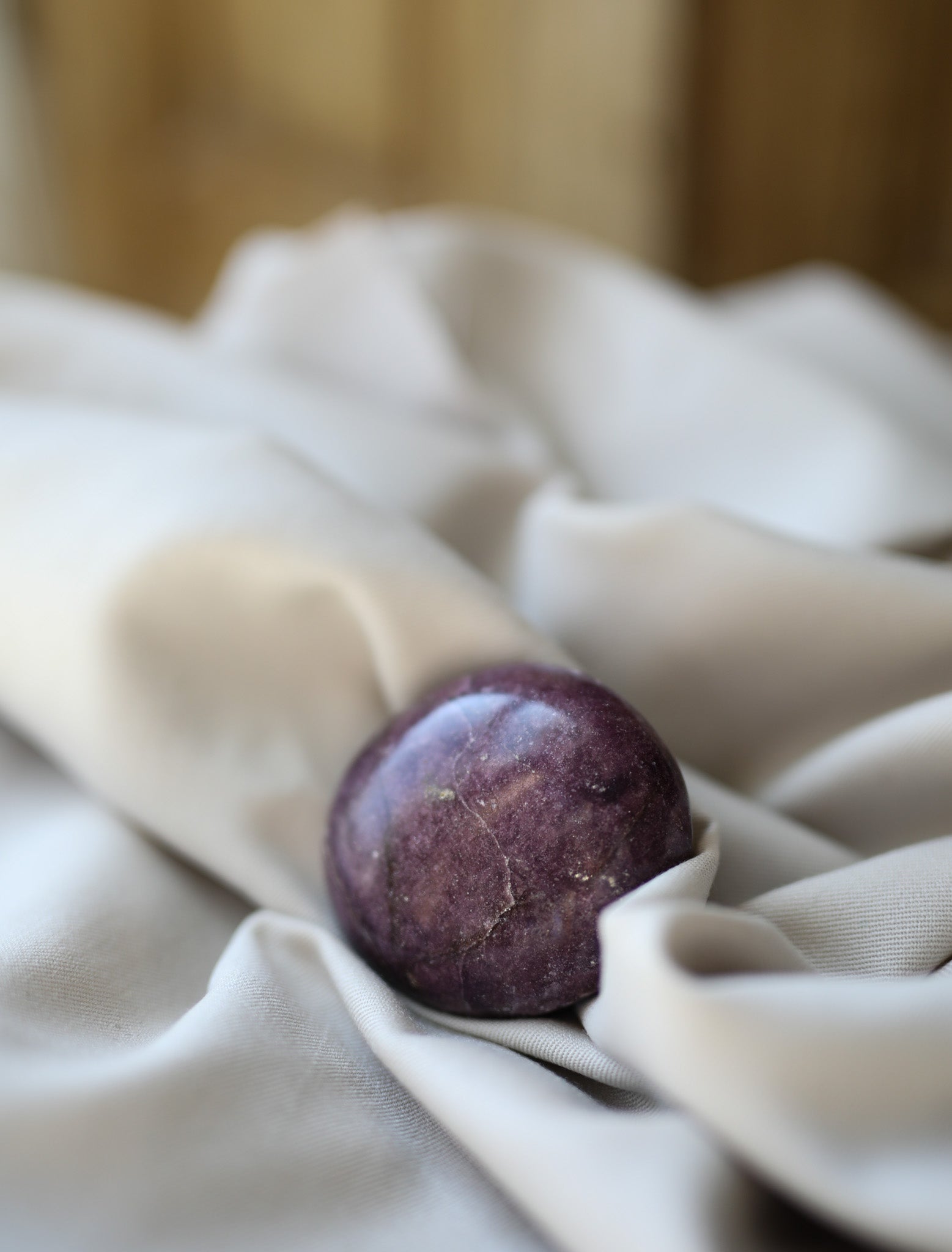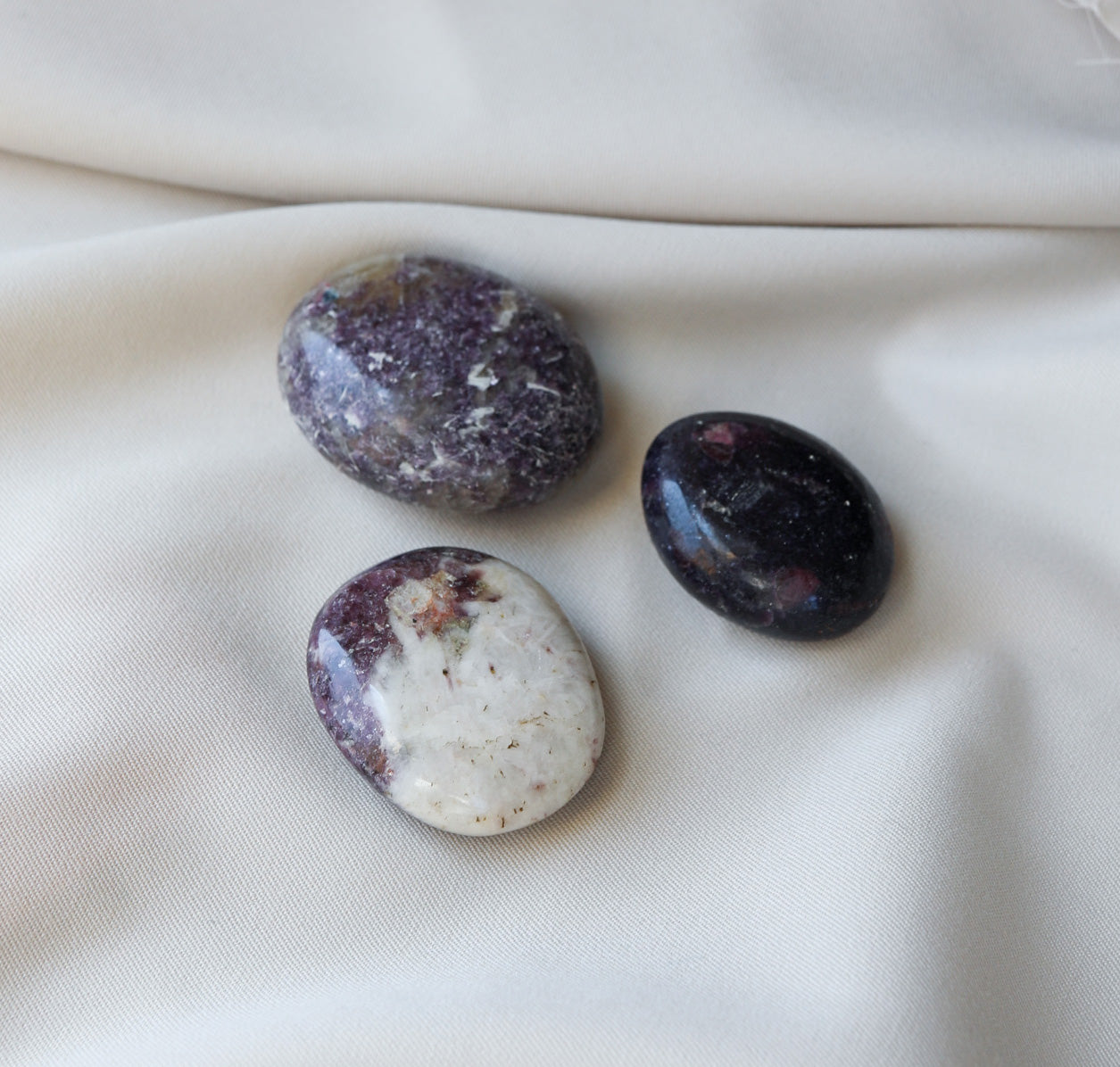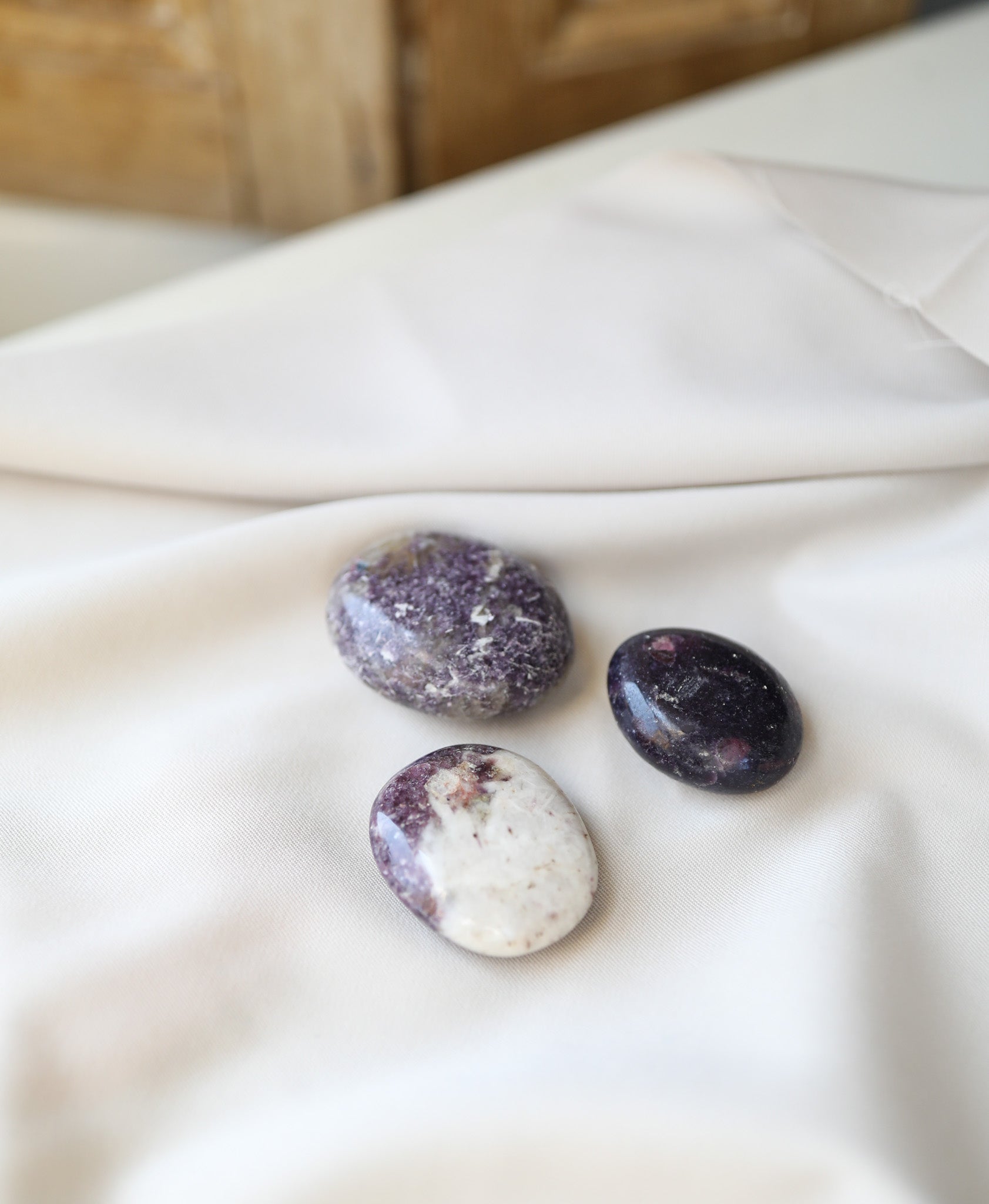 • Lepidolite is a lilac-colored mica mineral that contains lithium, occurring naturally in shades ranging from pale pink to deep purple. It typically appears in scaly or layered formations due to its mica composition, with a pearly or vitreous luster that gives it a shimmering, silvery appearance when light hits its surfaces. The stone can form in both massive chunks and smaller crystalline plates, often appearing alongside other minerals like tourmaline and quartz, and may (in its raw form) display a granular or flaky texture characteristic of mica minerals. Our palm stones are polished with a smooth finish.