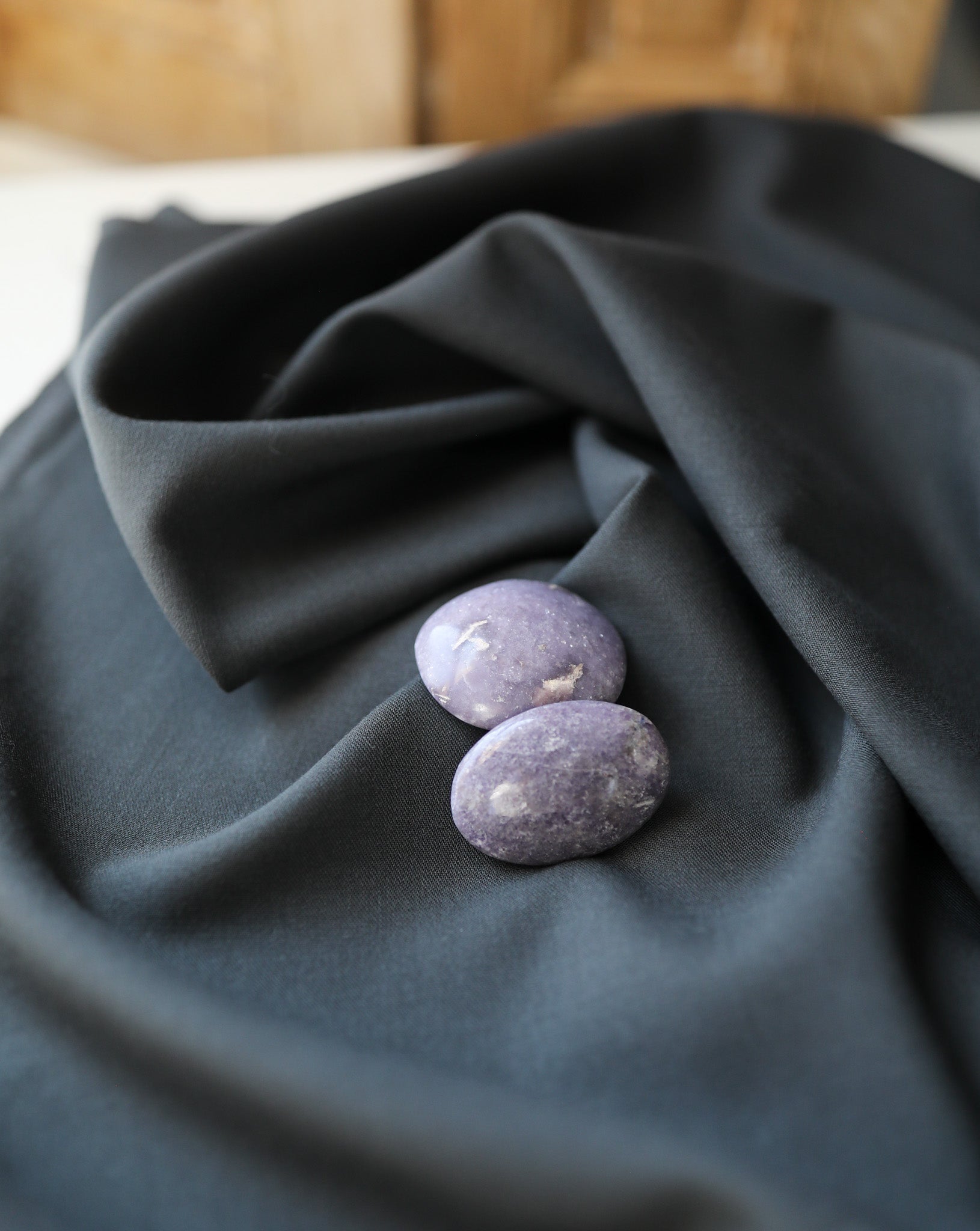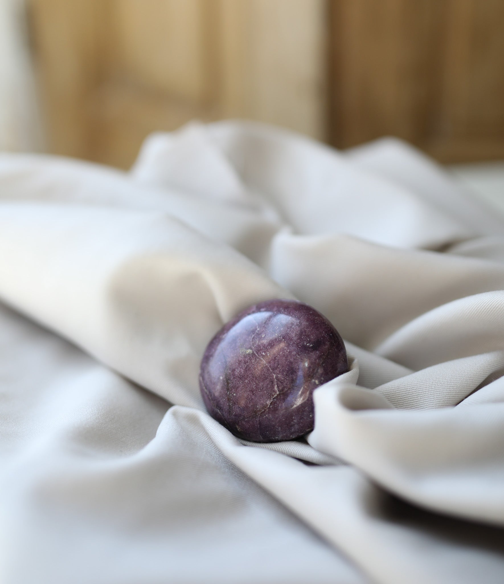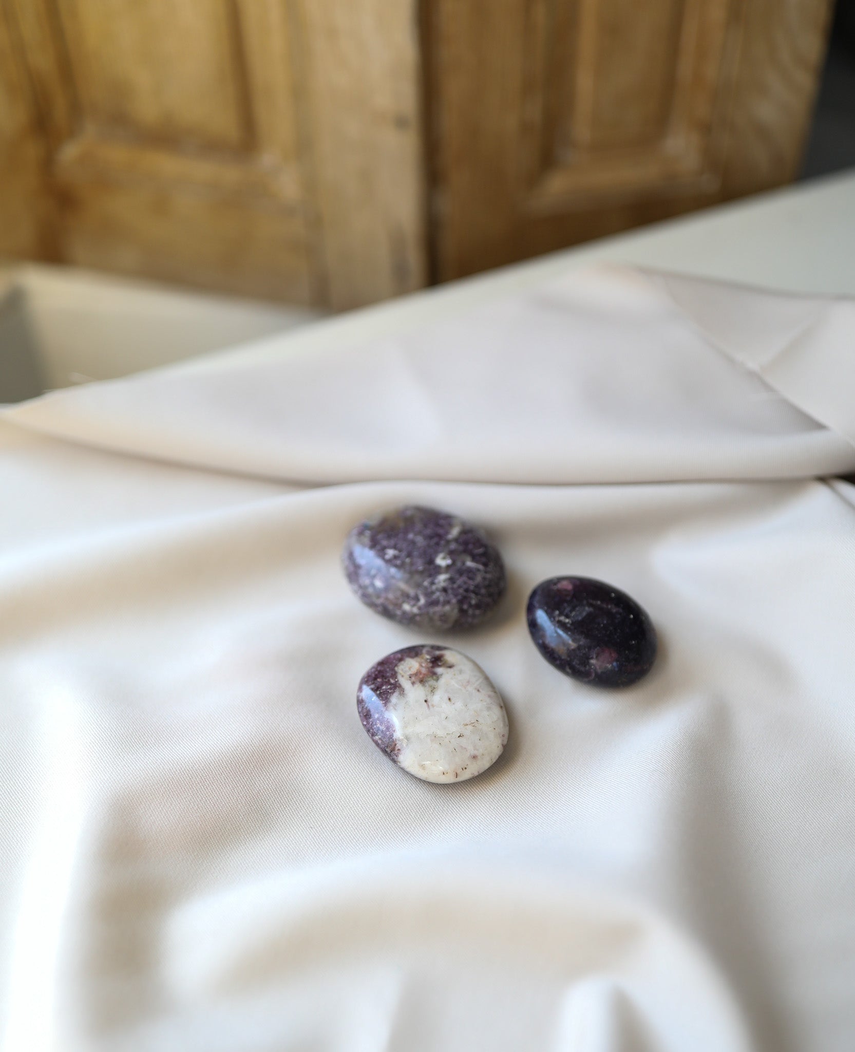 • Lepidolite is a lilac-colored mica mineral that contains lithium, occurring naturally in shades ranging from pale pink to deep purple. It typically appears in scaly or layered formations due to its mica composition, with a pearly or vitreous luster that gives it a shimmering, silvery appearance when light hits its surfaces. The stone can form in both massive chunks and smaller crystalline plates, often appearing alongside other minerals like tourmaline and quartz, and may (in its raw form) display a granular or flaky texture characteristic of mica minerals. Our palm stones are polished with a smooth finish.