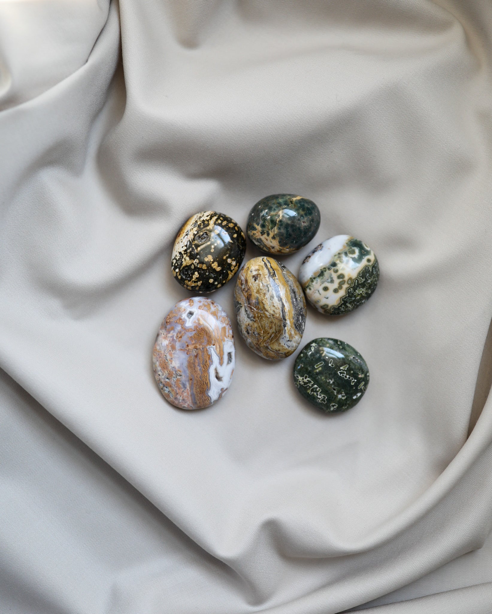 • Each palm stone's pattern and exact shape is unique, but mostly oval and measuring 2"-3" in diameter, allowing the stone to fit beautifully in one's palm, or to be placed on the body